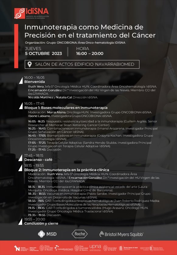 El próximo 5 de octubre celebraremos en IdiSNA la sesión ‘’Inmunoterapia como medicina de precisión en el tratamiento del cáncer’’ organizado por el Grupo ONCOBIONA, del Área de Onco-hematología de IdiSNA. Patrocinado por MSD, Roche y Bristol Myers Squibb.