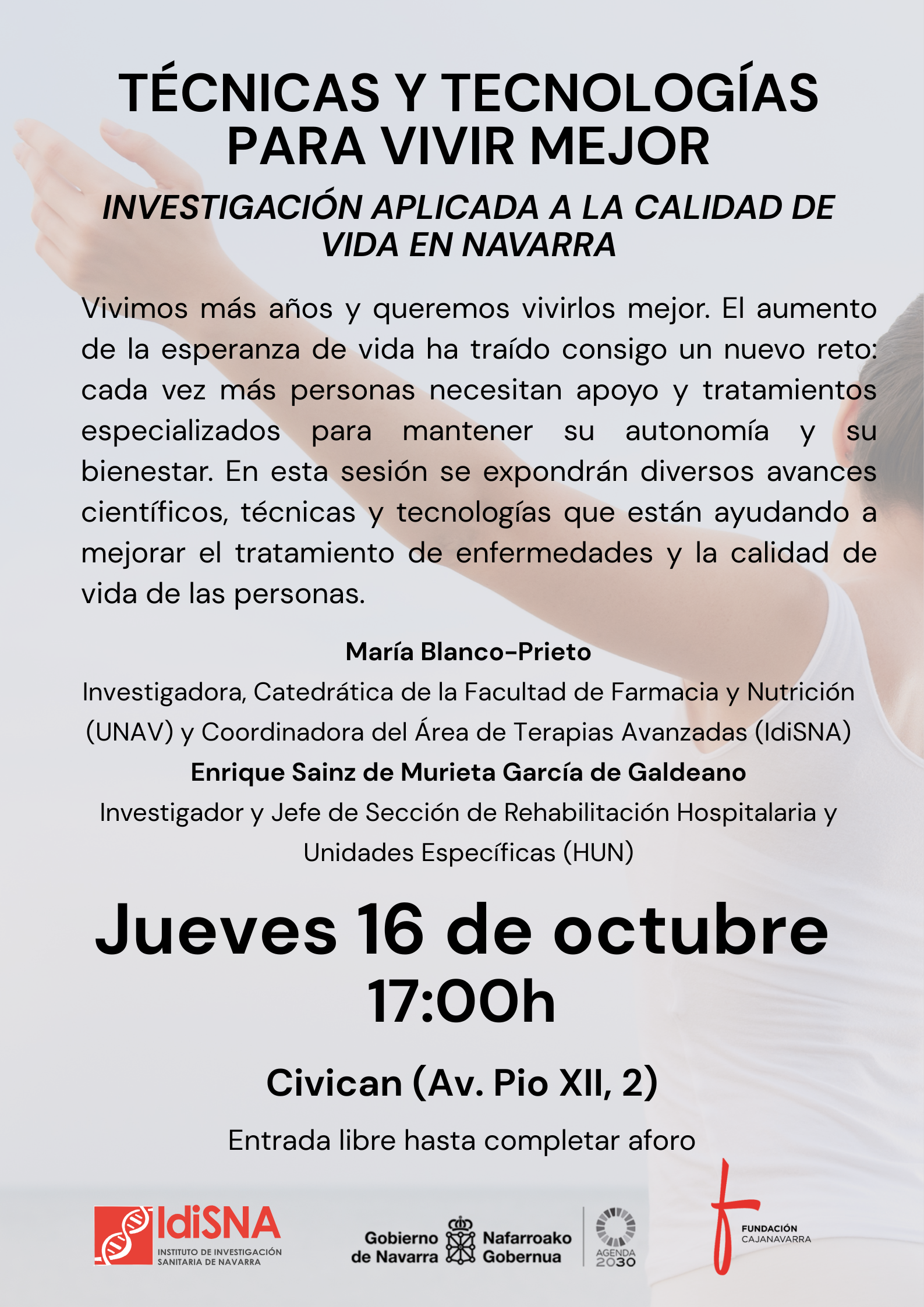 Jueves 16 de octubre a las 17:00h en CIVICAN charla “Técnicas y tecnologías para vivir mejor: investigación aplicada a la calidad de vida en Navarra”. El objetivo de esta sesión es mostrar cómo la investigación puede tener un impacto real y directo en la vida de las personas, ayudando no solo a que vivan más sino a que vivan mejor. Hablaremos con María Blanco-Prieto, Investigadora Catedrática de la Facultad de Farmacia y Nutrición (UNAV) y Coordinadora del Área de Terapias Avanzadas (IdiSNA), así como con Enrique Sainz de Murieta García de Galdeano, Investigador y Jefe de Sección de Rehabilitación Hospitalaria y Unidades Específicas (HUN). Nos mostrarán cómo distintas líneas de investigación aplicada, con investigaciones que se han duplicado en número del año 2020 al 2023 están ayudando a mejorar la calidad de vida de las personas, desde la salud hasta la autonomía en las actividades de la vida diaria. Descarga el cartel