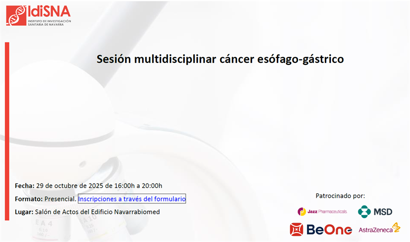 El miércoles 29 de octubre a las 16:00h tendrá lugar en el Salón de Actos del Edificio Navarrabiomed la Sesión Multidisciplinar “Cáncer esófago-gástrico”