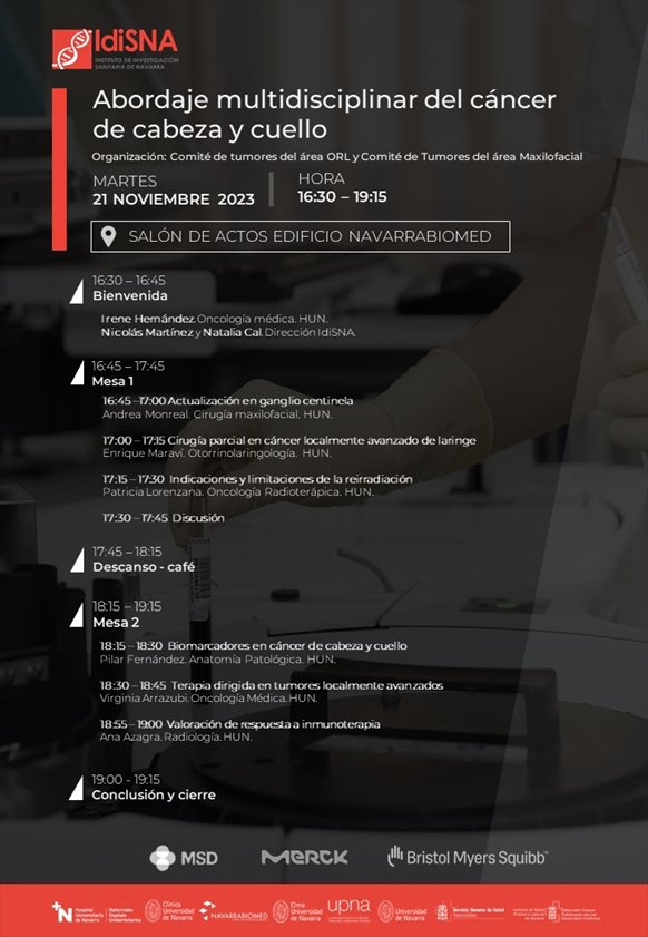 El próximo 21 de Noviembre celebraremos en IdiSNA la sesión ‘’Abordaje multidisciplinar del cáncer de cabeza y cuello’’ organizado por el Comité de tumores del área ORL y Comité de Tumores del área Maxilofacial. Patrocinado por MSD, Merck y Bristol Myers Squibb.
